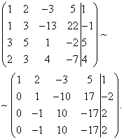 Теперь с помощью третьего уравнения исключим переменную из четвёртого уравнения. Для этого к четвёртой строке прибавим третью, умноженную на . Получаем расширенную матрицу трапециевидной формы.