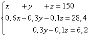 Пример 5. Три куска сплава имеют общую массу 150 кг. Первый сплав содержит 60% меди, второй - 30%, третий - 10%. При этом во втором и третьем сплавах вместе взятых меди на 28,4 кг меньше, чем в первом сплаве, а в третьем сплаве меди на 6,2 кг меньше, чем во втором. Найти массу каждого куска сплава.